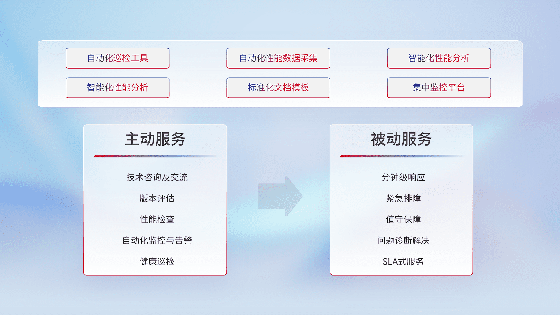 智能化工具和标准化文档,,,,保障服务质量,,提供主动服务(包含技术咨询、、版本评估、、、性能检查、、自动化监控与告警、、健康巡检)和被动服务包含(分钟级响应、、、紧急排障、、、、值守保障、、问题诊断解决、、、SLA服务)。。。