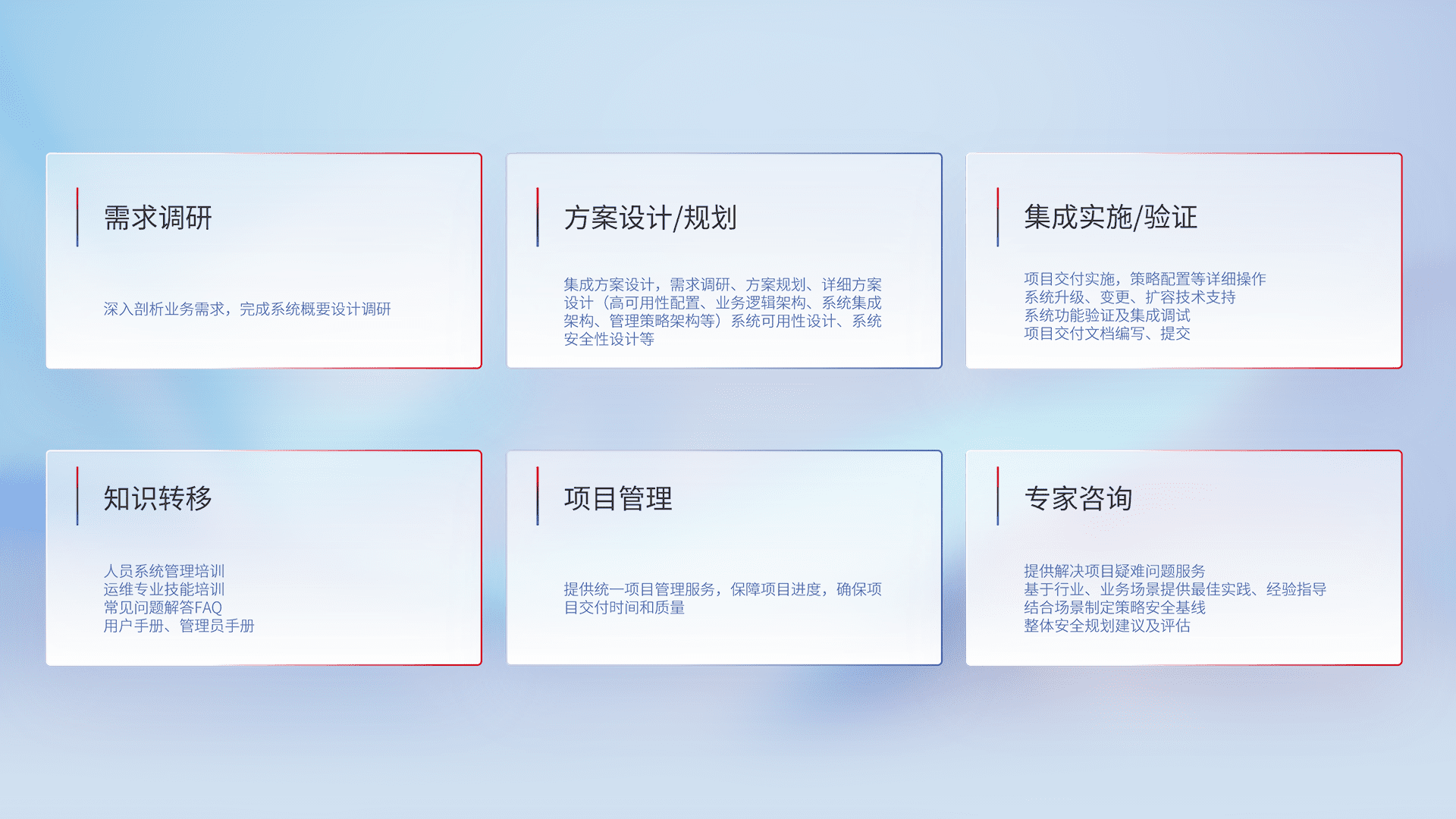 针对客户行业特性,,将宏观的安全战略和需求,,,,通过专业的交付服务,,,实现项目落地,,为客户提供标准规范的集成交付服务。。